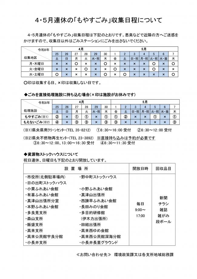 4・5月連休のもやすごみ収集日程は、次のとおりです。