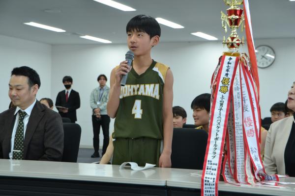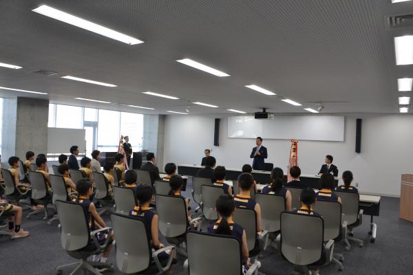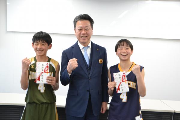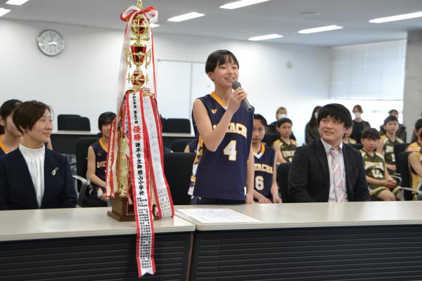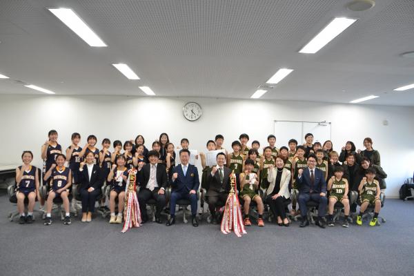 御館山小学校女子バスケットボール部と上山男子ミニバスケットボールクラブの選手たちが東京都で開催される「第57回マクドナルド全国ミニバスケットボール大会」に出場するため諫早市役所に表敬訪問を行いました。